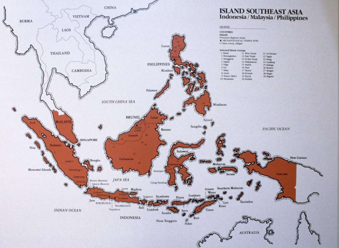 地图用橙色区域表示海洋东南亚所涵盖的区域范围,标注了其中部分的岛屿、市镇、村庄、族群和考古遗址。须注意,虽然右上角的标题强调了印度尼西亚、马来西亚和菲律宾等国家,但是海洋东南亚还包括新加坡、文莱和东帝汶等国家。该地图为达拉斯艺术博物馆1992 年收入的藏品。本照片为达拉斯艺术博物馆展览记录系列的一部分,达拉斯艺术博物馆提供给The Portal to Texas History(北德克萨斯大学图书馆托管的数字资源库)| 图片来源:The Portal to Texas History