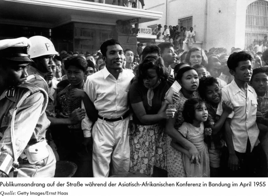 万隆会议的开幕式,以一种充满象征意义的“独立游行”拉开帷幕。作为会议的重要环节,印尼主办方邀请各国与会代表从下榻酒店步行前往主会场。代表们或身着传统服饰,或西装革履,在欢呼的人群中昂首阔步。学童、商界人士和众多记者高呼解放。据当时的目击者描述,现场气氛堪称一场“万国盛会”。这场“独立游行”是世界去殖民化进程不可逆转的生动体现,体现了这一运动与人民之间的深厚连结与共同愿望。本图片由Ernst Haas拍摄 | 图片来源:德国联邦政治教育局