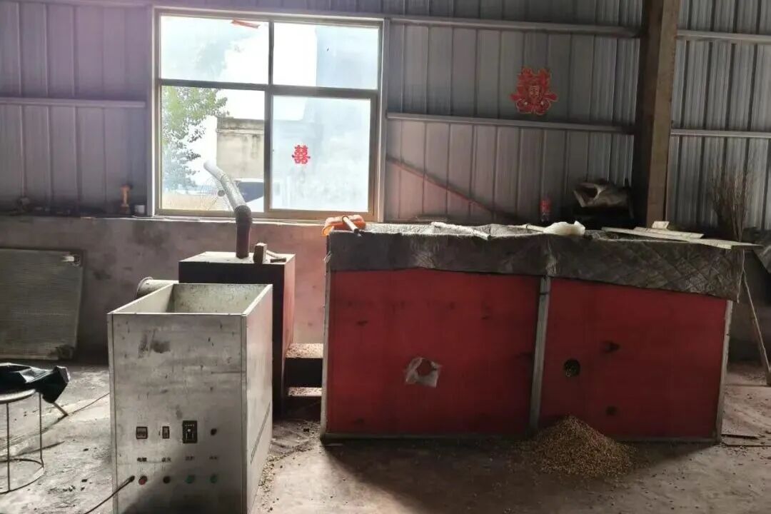 下雨闲着没事,自动化专业出身的孙明琢磨了一套小型烘干机。他自己画图纸,再找周围的工厂用机床加工,花了3000块钱做了一套简易的烘干机。这台烘干机可以通过燃烧玉米芯制作的燃烧颗粒,或者直接烧柴火,通过产生的热风烘干玉米。