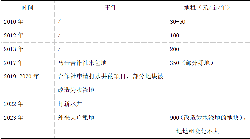 2022年,在原先机井的基础上,海哥所在的村小组靠政府补贴修了新井。打完新水井的第二年,农民还没来得及享受政府项目的利好,村小组的小组长就靠自己的关系,引入了外村的一家种植户,把这些改良过的水浇地承包走了。外来大户直接给出了900元/亩的承包价,而作为中间人的小组长也获得了每亩50元的中间费。按照白大爷的说法,地租从700元涨到900元的时候,就是“资本运作”了(地租变化情况见表1)。
