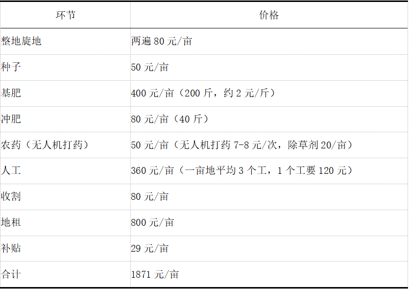 首先,如果是自己的承包地,种植主粮(例如玉米、小麦)的亩均投入在400~600元。但如果是流转地,还要加上700~900元的地租,亩均投入就上涨到了1500元左右。后者实际算出来的亩均投入还要更高(见表2)。即使农户有大部分的农机,但还是要在部分环节购买社会化服务,例如整地旋地,这个普遍的收费标准是80元/亩。小农户一般不需要无人机飞防,如果是自己买农药来打,一般是出苗的时候打一遍(15元/亩),长草的时候打一遍(10元/亩),如果是请人工来打药则更贵。化肥是除去地租最贵的一项支出,通常一亩地要用到130多斤化肥,如果第一遍施肥效果不佳,还要再冲一次肥。一般一亩地要投入化肥200元左右。