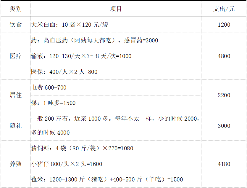 表4:冯大爷和妻子一年的收支。注:上图支出并没有包括用水、蔬菜肉类等项目;此外,还要考虑到大额的医疗支出,2022年冯大爷做了胆结石手术,除医保报销外还支出了4万元。