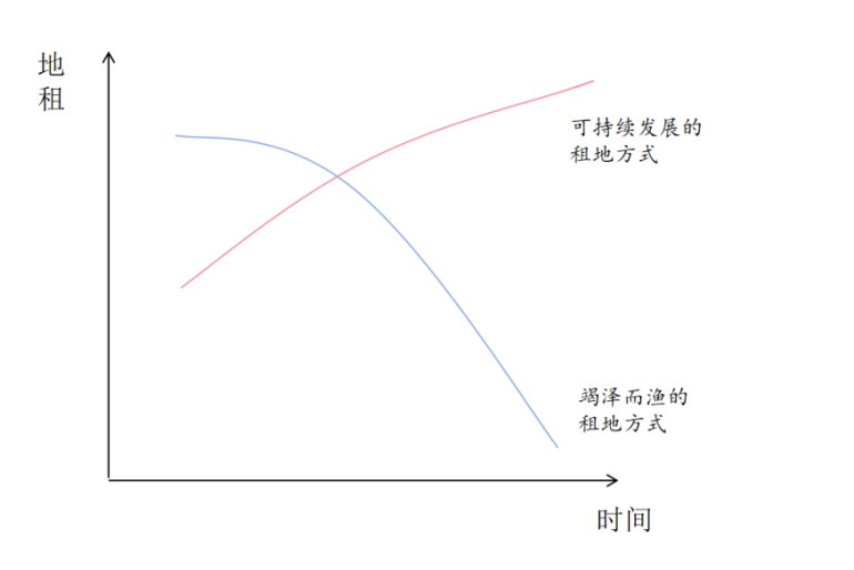 正如下图所示,大资本采取的是高投入、高产出的生产逻辑,但是如前所述,这种逻辑最终将竭泽而渔。参访最后一天,我们邀请了几位村民,开展了一次土地流转主题工作坊。工作坊中,村民们纷纷认同,高地租背后是短期利益压过了长期利益。在上一节所描述的困境中,如果全面依赖市场调节(价高者得,大资本挤压小资本),似乎这条曲线(下图蓝色曲线)是一个无解的必然趋势。