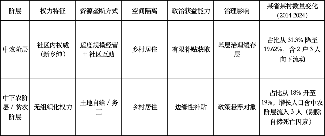 中下农与贫农阶层:缺乏组织化权力,长期居住于乡村,仅能获取边缘性补贴,成为政策悬浮的直接对象,难以分享乡村发展成果。