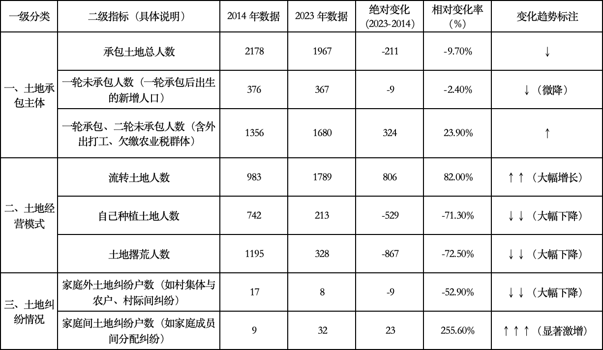 注 释:2014-2023年十年数据,是农村土地制度与城镇化、农业现代化适配的缩影,核心启示有四:一是以规模化土地流转破解“撂荒+低效”,需完善流转市场、规范合同并保障农户收益;二是关注“二轮未承包”群体(因外出务工、欠缴农业税未参与二轮承包),通过政策衔接(如减免历史欠税、补登承包权)保障其权益;三是针对土地财产属性增强引发的家庭间纠纷,依托村规民约与村级调解机制提前化解;四是长期关注新增人口“无地问题”,探索承包权退出补偿、集体经营性建设用地入市收益分配等替代保障机制。