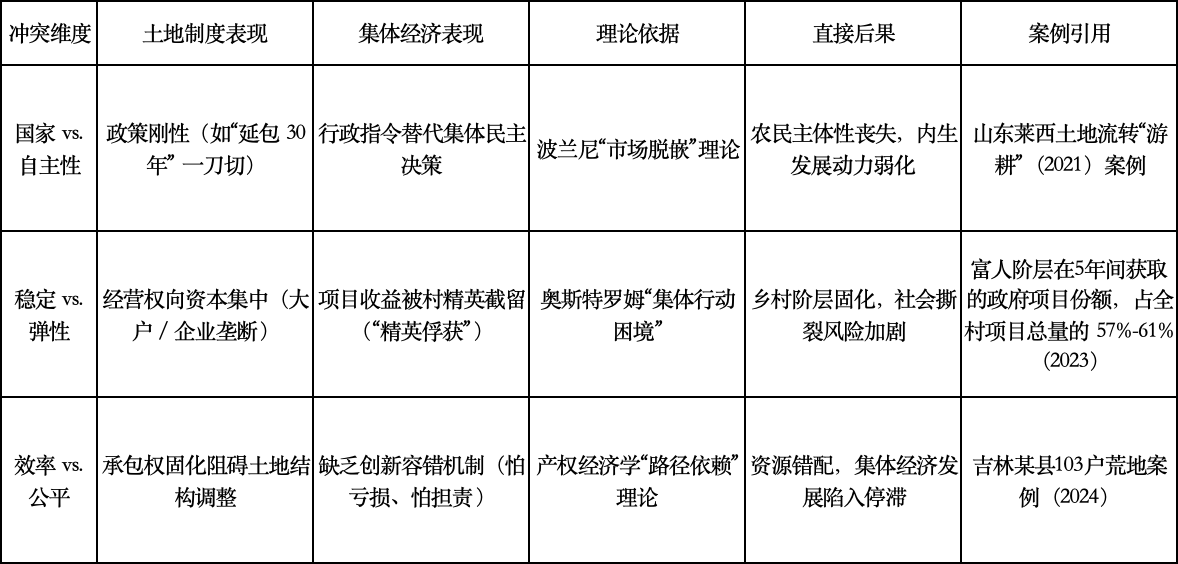在土地制度存在产权缺陷的背景下,土地制度与集体经济的联动陷入困境,其本质是“组织化不足”引发的治理逻辑冲突——国家、市场与农民三方的利益诉求,无法通过有效的组织机制实现协调。具体的冲突维度可通过下表进一步解析: