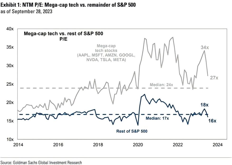 “七巨头”与其他公司的标普500指数(S&P 500)对比(2014-2023)。其中,