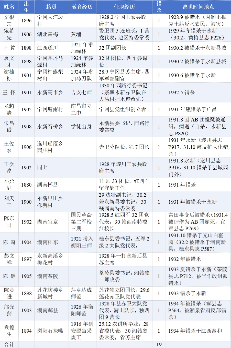 1980年代后期,井冈山革命博物馆编了一套书,这套书里面收录了91个人的简介,都是参与创建和领导井冈山根据地并担负过各级领导责任的人。这91人里面,只有21人幸存到解放后(其中还包括叛徒龚楚),另有5人病逝。非正常死亡的65人中间,战场牺牲有26人,死于敌人刑场的15人,最为沉痛的是有19人死于党内斗争中的错杀,约占30%;这样的过左肃反后果,是十分惨痛的。