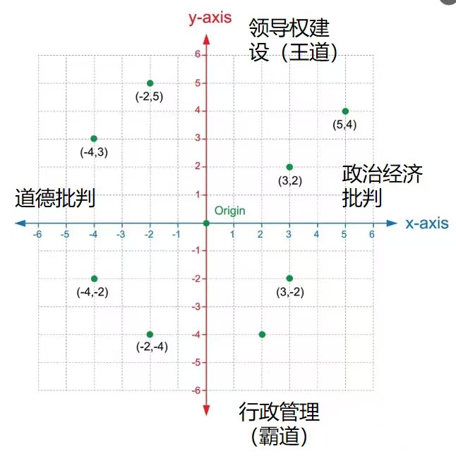 差不多是这个意思。之所以借用数学的象限来表达,是因为很多人没有经验,理解不了领导权、无产阶级专政、劳动人民的领导权建设,所以反复用类比来帮助大家理解,便于沟通。如果将来大家对劳动阶级的政治学很熟悉了,这个学科成立了,有共识了,概念体系大家都接受了,应该比我们今天讲的要简明得多。像毛主席说的,路线是纲,纲举目张。所以,你能看到纲,就可以提纲挈领,什么东西理解起来都很简单。但是现在内部和外部有各种不足,我们缺少这方面的视野和想象力,所以需要这些类比、繁琐、麻烦的表述方式。借用坐标轴的类比,一是要突出坐标轴上的原点,在原点的左边和下边,就是路线不正确,如果你连路都选错了,那你肯定就到达不了目的地。路线不正确,认识和战略战术选择,都不可能正确。