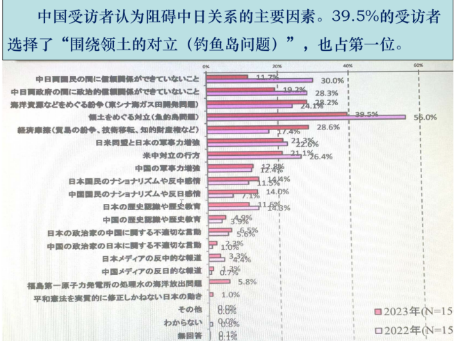 阻碍中日关系的主要因素是什么?2023年日本43.6%的受访者选择了“有围绕领土的对立(尖阁诸岛问题)”【编者注:日本所谓的尖阁诸岛即是钓鱼岛,下文有详细说明】。日本政府说没有领土问题,但实际上日本公众并不这样认为。他们认为,钓鱼岛问题是影响两国关系的主要因素,选择这个因素的受访者人数占第一位,这种现象已经持续十多年了。