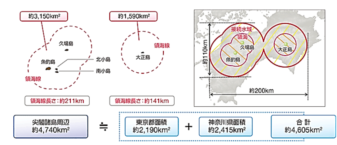 下面是日本的一张图,标明了钓鱼岛相关海域面积。日本将黄尾屿改为“久场岛”,其实久场岛在琉球群岛的另一个地方——庆良间列岛,日方完全是移花接木的套用。该图显示,钓鱼岛列岛领海及毗连区海域面积超过东京都与神奈川县面积的总和,达4740平方公里。另外,如果日本占有钓鱼岛,就会以钓鱼岛为中心划定直径400海里的专属经济区并切割中国的大陆架。400海里是什么概念呢?大约是740公里,而从北京到上海约为1000公里。这样划定的专属经济区的面积甚至比日本的本土面积还要大。在专属经济区内,别的国家是不能去科考、捕鱼、开采海峡资源的,所以钓鱼岛归属不仅仅是领土主权认知争议,还涉及到资源开发、海洋安全以及民族尊严等一系列问题。