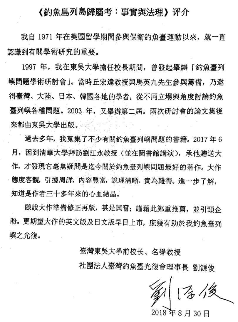 台湾东吴大学前校长、物理学家、曾任“台湾钓鱼台光复会”理事长的刘源俊教授于2018年8月30日为本书写了一个评介(见下图),给了本书一个很重要的评价。我第一次公开这一评介。为什么现在才拿出来?因为现在我可以向刘源俊校长报告,我没有辜负他的鼓励和期待。