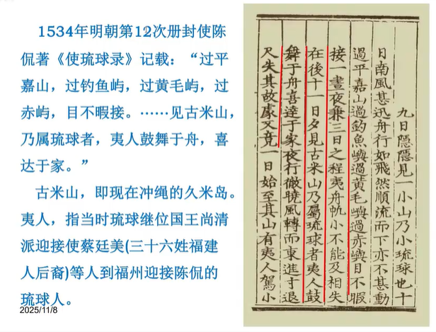 下图是1543年明朝第12次册封使陈侃所撰的《使琉球录》。我们可以看到其中的有关记载:“过平嘉山,过钓鱼屿,过黄毛屿,过赤屿,目不暇接。……见古米山,乃属琉球者,夷人鼓舞于舟,喜达于家。”古米山,即现在冲绳的久米岛。夷人,指当时琉球继位国王尚清派迎接使蔡廷美(三十六姓福建人后裔)等人到福州迎接陈侃的琉球人。