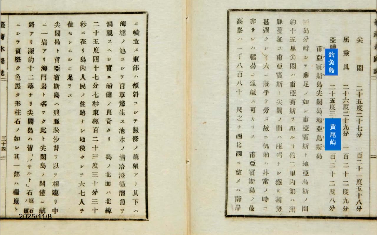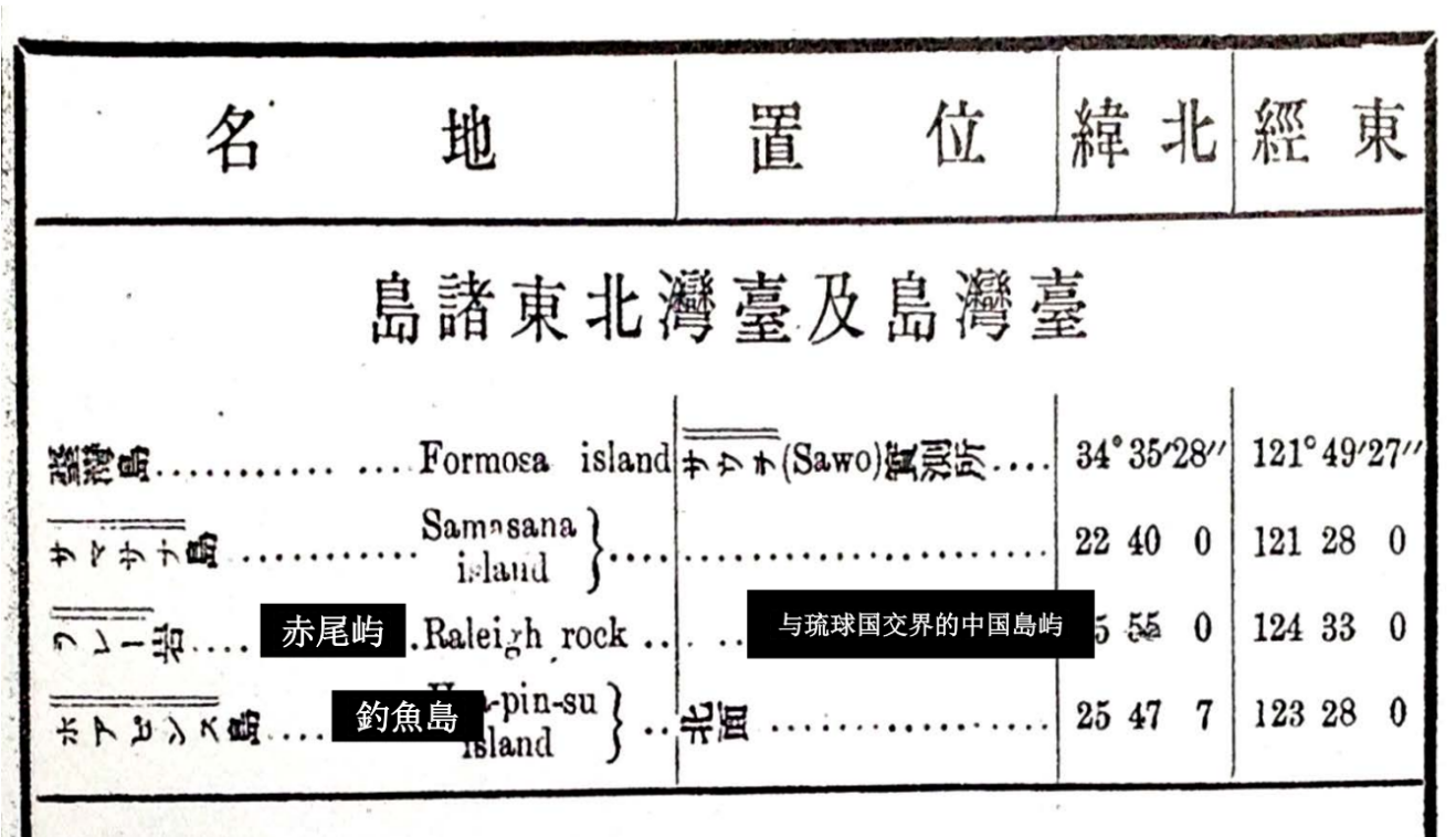 1871年中国的《重纂福建通志》一书,将钓鱼台作为噶玛兰厅(即台湾省宜兰县)的一部分记载。这部著作是根据我刚才提到的1722年黄叔璥的《台海使槎录》抄来的,只不过抄错了一个字。也可能因为雕版有疏漏,“可泊大船十余艘”多了一撇,写成了“千艘”,所以日本人就认为是假的——钓鱼台哪能容纳千艘船停泊?这肯定是假的。