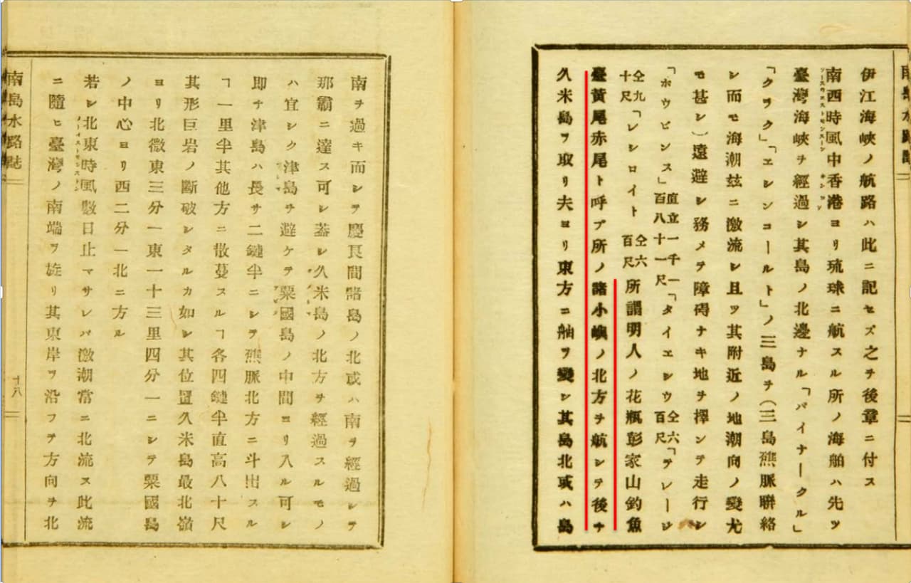 下图是清朝册封副使徐葆光撰写的《中山传信录》中收录的一幅海上针路图。上面的红线是我画的,其右边是中国,左边是琉球。我们可以看到,从福建出来,经过钓鱼台、黄尾屿、赤尾屿,到久米岛(古称古米岛)之后,才是琉球的岛屿。