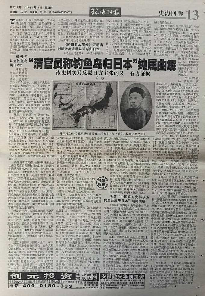 其二是,日方曲解中国清朝官员傅云龙1889年编撰的《游历日本图经》一书,谎称该书证明清朝官员曾认为钓鱼岛是日本领土的一部分。对此,我早在2015年1月15日《环球时报》的文章中进行了澄清:这位外交官叫傅云龙,他从未承认琉球属于日本,他的游记中绘制的疆域图也不包括琉球。至于未提及钓鱼岛,是因为当时它被视为无人岛,但这绝不等于承认其属于日本。日方对这段文献的解读完全是歪曲历史。