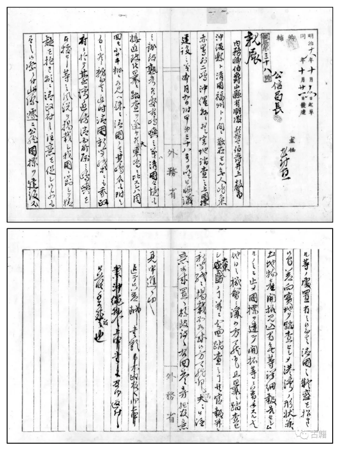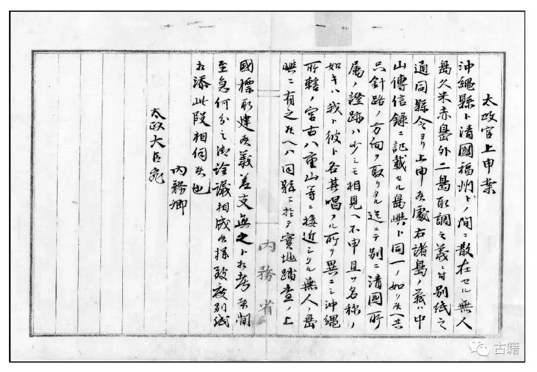 1885年10月9日,山县有朋在给太政大臣的“太政官上申案”中称:“关于该等岛屿,虽似被指出系与《中山传信录》所载岛屿为同一岛屿,但只提及指明航向,且无任何清国所属痕迹,且日本与清国各自岛名不同,又系接近冲绳县所辖宫古岛和八重山岛等的无人岛,故冲绳县实地勘察后即可建立国标无妨。”(见图7)