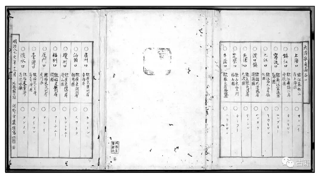 该图是1875年由“日本海军省水路寮”(后改称水路局、水路部,是日本海上保安厅海洋情报部的前身)参照英国文献和中国地图手绘的精细彩色地图,并经日本外务省仔细确认和公示过,代表了当时日本官方的正式立场及最高绘图水平。日本海军省相关机构在1923年东京大地震中被毁,许多资料文献失传,而该图绘好后即被日本外务省入库,故能保存至今。该图现藏于日本国立公文书馆(馆藏号:292-0116),原件高113.5cm、宽86.4cm,呈长方形,按大约二百五十万分之一的比例缩小,东西跨度为东经128°至112°30′附近,南北为北纬21°30′至41°30′附近,该封皮上的标题为《大清通商十五口图》(见图 2),封皮内是外务省官员河野雪巌誊写的清朝政府允许通商的15个港口的名称(见图 3)。