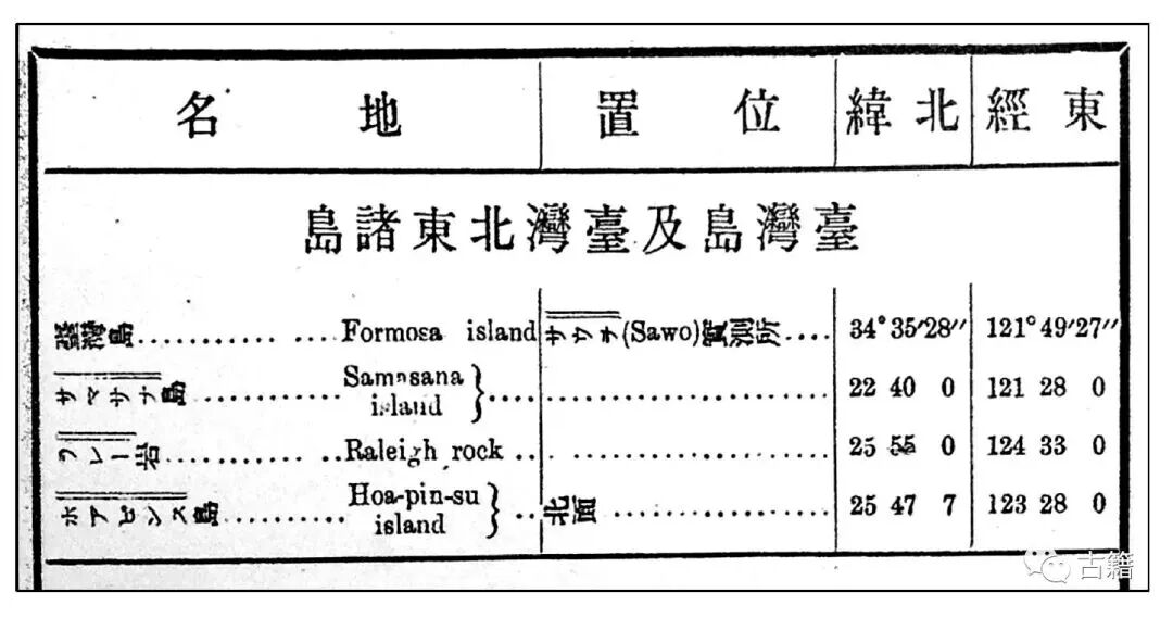 再如,《台湾水路志》中所谓“刺列字岩”是英国人命名“Raleigh rock”的日语音译汉字,即指赤尾屿;其中的所谓“尖阁岛”英文原文为“Pinnacle I”,则是指台湾附近的花瓶屿(中国译者王德均曾将其译为汉字“凸岛”)。在“尖阁岛”下面记载的“屈来具岛”、“亚神可留土岛”分别是指棉花屿、彭佳屿(见图12)。
