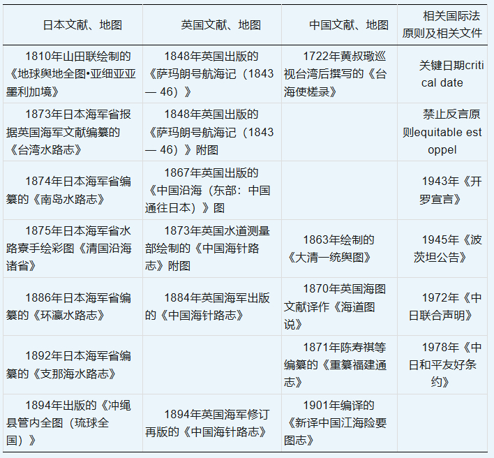表2:本文所述及甲午战争前日本认定钓鱼岛属于中国的证据、国际法原则及文献