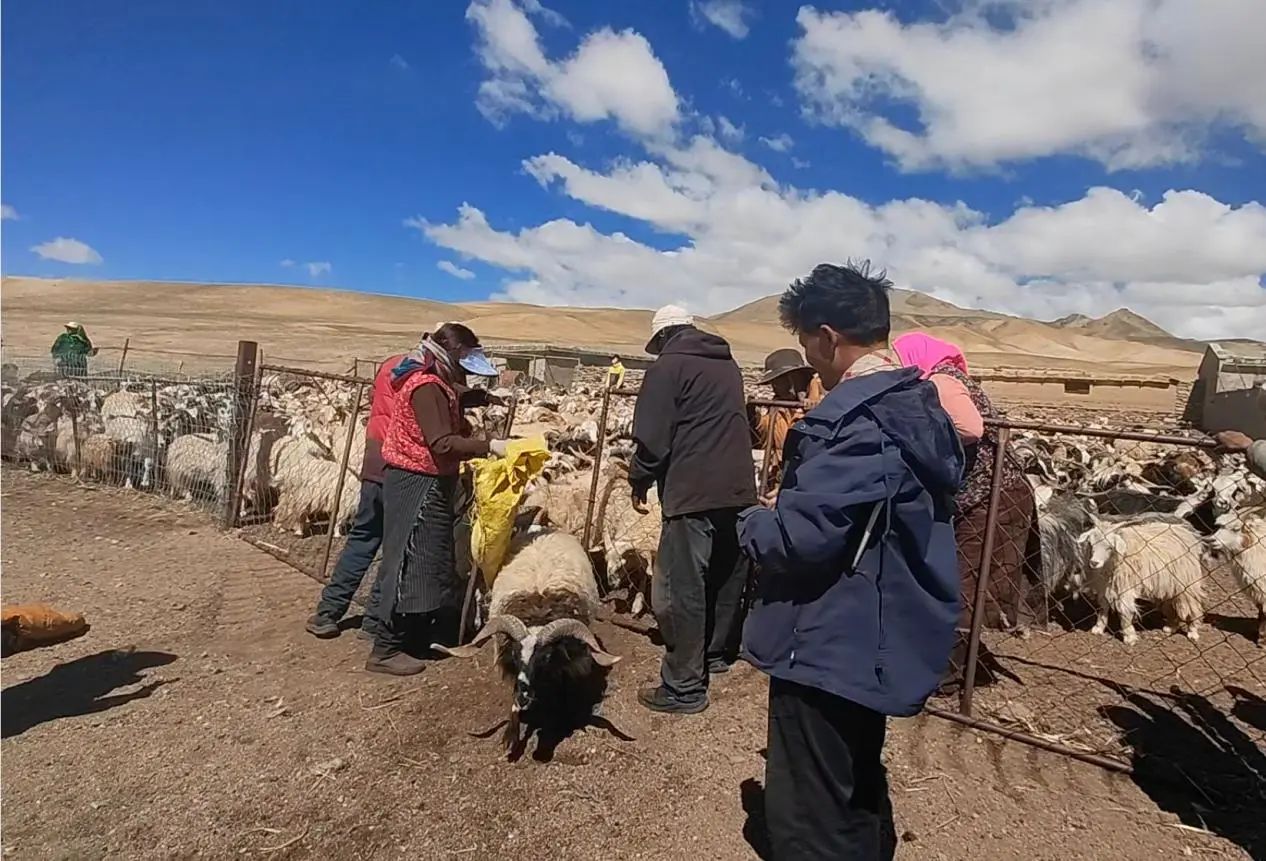 嘎措一村嘎多书记和牧民们在围栏门口数羊,为夏季看畜工作的交接做准备