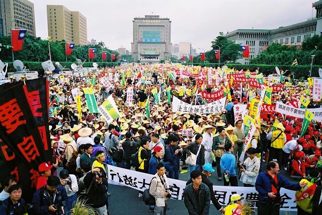 2002年,基层农会想要对抗大资本,发展内部金融部门,但是陈水扁当局强势接管农会的金融部门,控制了36家农会的金融部。对此,我们在每个村都动员开会,开了6000多次会,最终决定包围“总统府”。农会总干事不敢出头,我就带头去干,因为我曾参加过党外运动,也当过兵,可以说是农民的精神领袖。农渔会每人八百、一千地凑了钱,租了2千辆游览车,虽然带了臭鸡蛋、烂番茄去抗议,但为了保证行动“理性和平”的进行,并没有扔鸡蛋和蔬菜。陈水扁甚至私下里找到这些卡车司机,想要收买他们,但是没有成功。游行当天有12万人走上凯道。