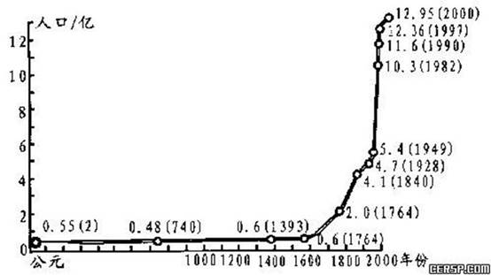 接下来,再看工业文明以来的一个变化。首先看人口。我们看上边这张是满10亿、20亿、30亿人口时间段,1850年到1950,我们现在是70几亿。右边这张图从一个更长的历史周期来看人口,在短短的两三百年里,人口数量急剧地增加,人类活动对地球形成的压力也越来越大。我们中国人口也是,你看我们在公元年,几百年前,1000年前我们的人口数都很低,处于一个很平衡的状态,但是我们到1840年以后我们人口急剧地上升到12.9亿,现在是13亿多。
