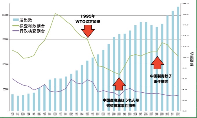 现在进入正题。首先,农民连食品分析中心,它到底是怎样一个机构?中心成立于1996年5月,全部分析仪器都是通过普通人的捐款所购买的。像我们这种通过捐款成立的分析中心,在日本是最大的一家。以这种形式运转的机构,恐怕全世界少见。中心成立的背景之一,是当时日本加盟了WTO国际协定,进口食品数量激增。WTO国际协定是一个强有力的自由贸易协定。在此影响下,包括食品在内的很多商品陆续从海外涌入日本。然而,在维护国民食品安全方面,当时日本国家级的检疫机构都做了什么呢?我们可以看一下这个表。绿色的线是日本国家级检疫机构的检查率。1995年,当日本加盟WTO国际协定之后,这个数字一下就掉了下来。