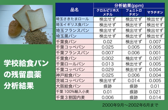 我们曾对日本中小学营养午餐当中的面包进行过农药残留的调查。日本中小学营养午餐中使用的全部是进口小麦。为了不让食材在运输过程中发霉、虫坏,要对其进行农药熏蒸,专门用语叫“Post Harvest 农药”,即采后农药。营养午餐面包的检测结果显示,学校发给孩子的面包里含有农药残留。图片上面的4种面包完全使用日本国产小麦制作,没有检测出任何问题。从第5种开始,每种面包都使用了海外进口小麦,多多少少,均有农药残留。我们向公众揭发了此事。基于我们提供的数据,学校供餐从使用进口小麦改为使用国产小麦的行动也开始了。