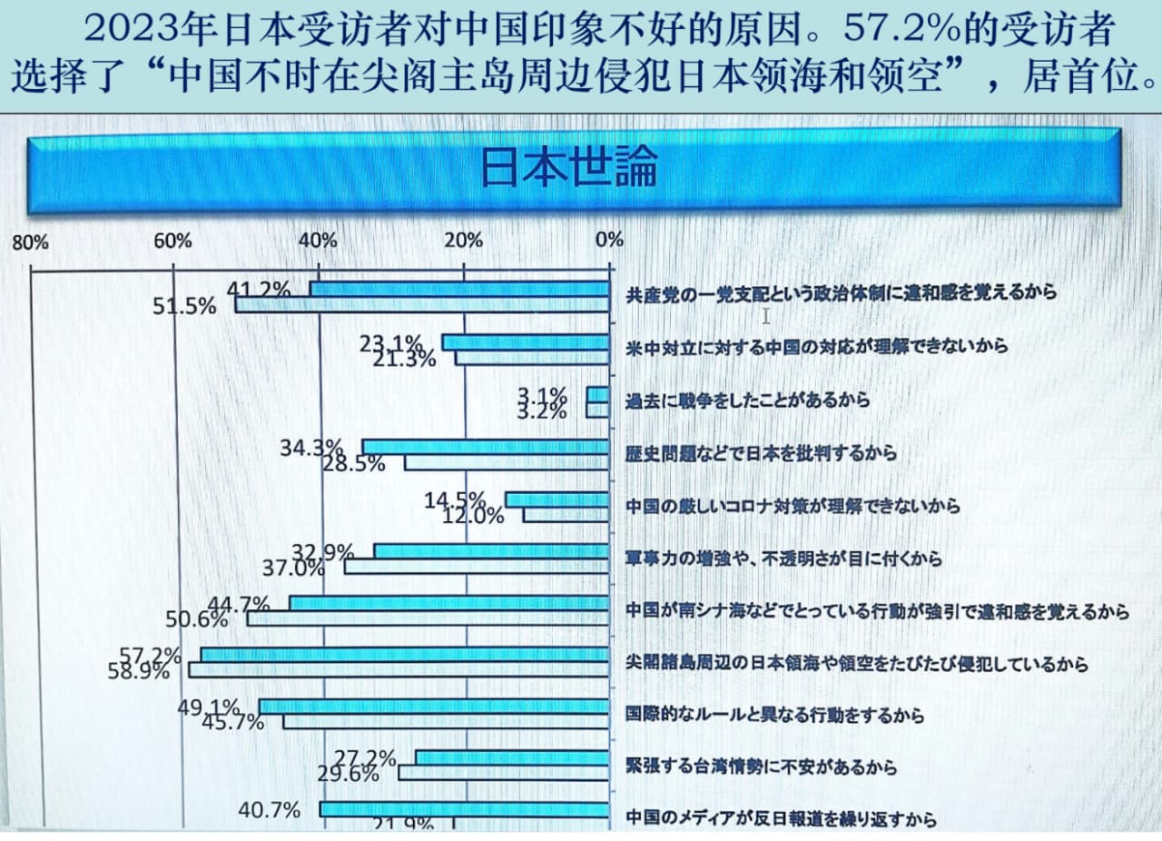 2023年10月,日本一家所谓的民间团体——“言论NPO”(其背后实际上是外务省支持的),和中国国际传媒集团做了一项民意调查。调查结果显示,92.2%的日本受访者对中国没有好印象。2025年10月又有新的调查结果,目前还没有公布。我认为,统计结果不会有根本性变化。