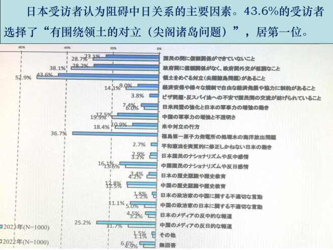阻碍中日关系的主要因素是什么?2023年日本43.6%的受访者选择了“有围绕领土的对立(尖阁诸岛问题)”【编者注:日本所谓的尖阁诸岛即是钓鱼岛,下文有详细说明】。日本政府说没有领土问题,但实际上日本公众并不这样认为。他们认为,钓鱼岛问题是影响两国关系的主要因素,选择这个因素的受访者人数占第一位,这种现象已经持续十多年了。