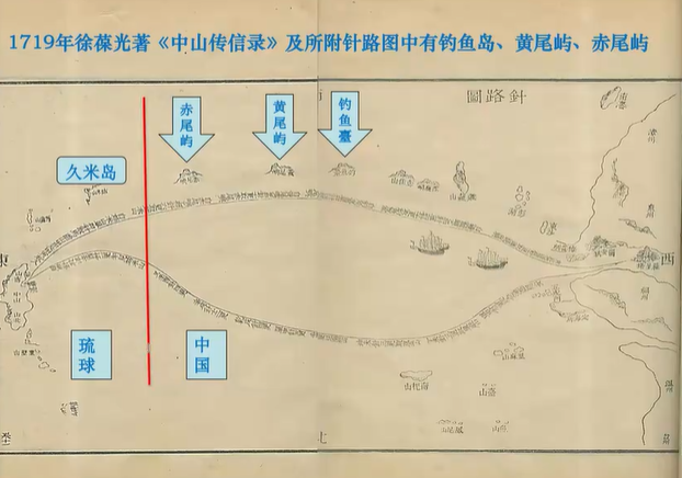 下图是清朝册封副使徐葆光撰写的《中山传信录》中收录的一幅海上针路图。上面的红线是我画的,其右边是中国,左边是琉球。我们可以看到,从福建出来,经过钓鱼台、黄尾屿、赤尾屿,到久米岛(古称古米岛)之后,才是琉球的岛屿。