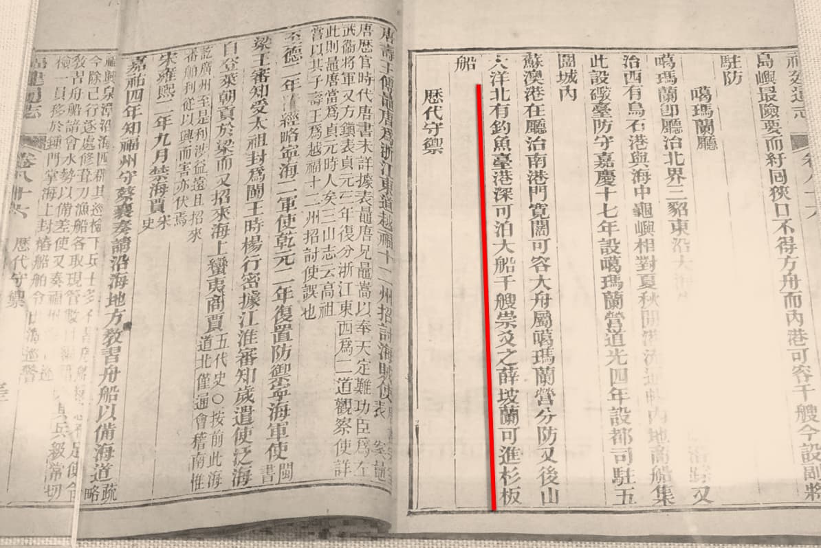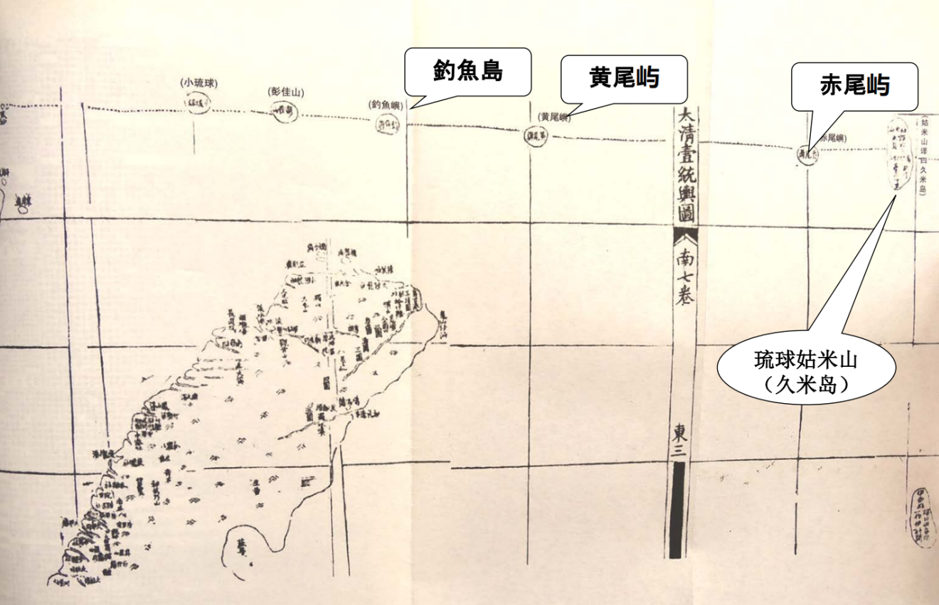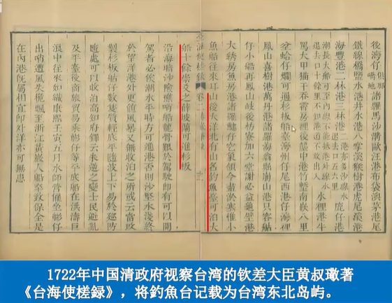 1871年中国的《重纂福建通志》一书,将钓鱼台作为噶玛兰厅(即台湾省宜兰县)的一部分记载。这部著作是根据我刚才提到的1722年黄叔璥的《台海使槎录》抄来的,只不过抄错了一个字。也可能因为雕版有疏漏,“可泊大船十余艘”多了一撇,写成了“千艘”,所以日本人就认为是假的——钓鱼台哪能容纳千艘船停泊?这肯定是假的。