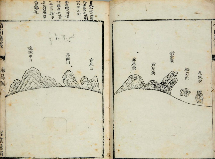 下面这张图是程顺则在《指南广义》中所绘《海岛图》,将赤尾屿和古米山作为中琉之间的分界。赤尾屿、黄尾屿、钓鱼台等画在右侧(中国)一页,而古米山(久米岛)及其以东的马齿山(庆良间诸岛)、琉球中山等琉球岛屿则画在左侧(琉球)一页。