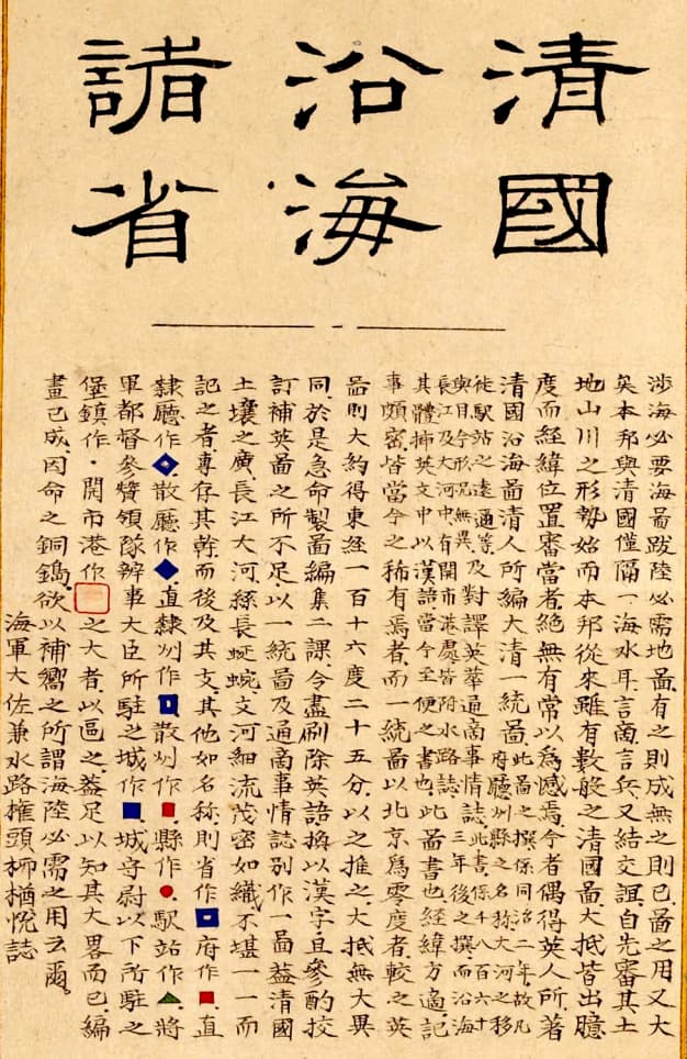 1863年中国的《大清一统舆图》记载钓鱼岛列岛属于中国。日本海军省1875年完成的《清国沿海诸省》地图曾以此为据,将钓鱼岛列岛画入中国版图。