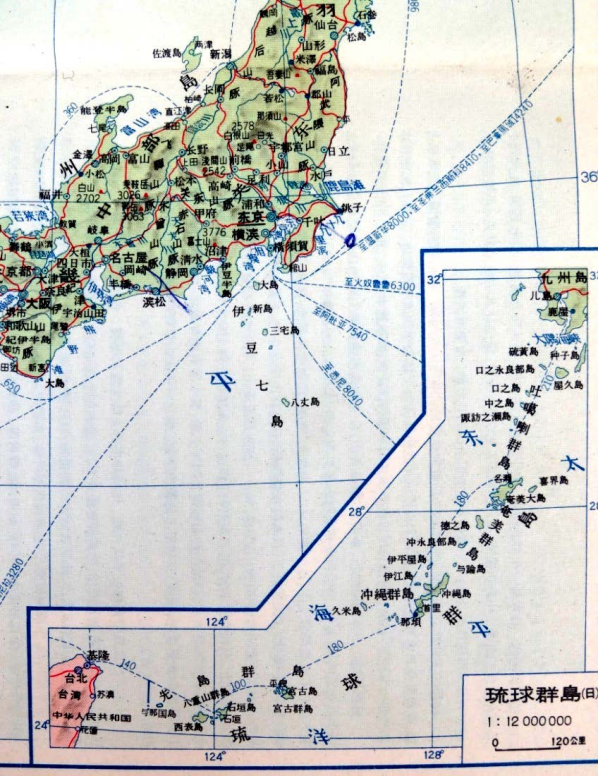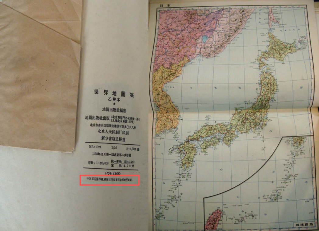 日方还拿出一些中国出版的世界地图,以证明所谓新中国出版的地图将钓鱼岛划进了日本版图。例如,关于日方出示了1958年中国地图出版社出版的《世界地图集》的日本地图。该图将台湾中部、北部和东北各附属岛屿划入琉球群岛范围,而在钓鱼岛部分的海上边界不详。于是,日方便以此为据称中方承认钓鱼岛属于日本。