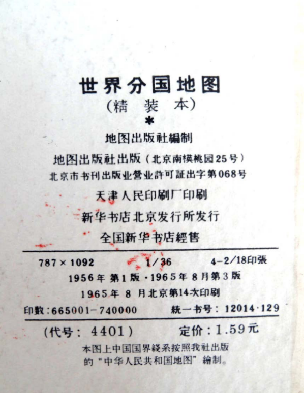 1958年中国地图出版的《世界地图集》,有关中国部分国界线是根据抗日战争前申报地图绘制,
