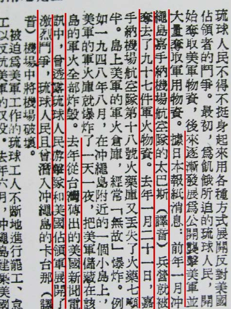 我之所以判断它是一篇编译“资料”,是因为在短短一篇文章中连“嘉手纳”(美国驻日本最大的空军基地)这一地名都出现了两种译法:一处写为“嘉手纳”,另一处却写成“卡台纳”,并在括号里标注“译音”。实际上,“嘉手纳”在日语中的发音为“Katena”,这明显是编译的材料来源不一造成的混乱。此外,这篇文章没有作者署名,只注明“资料”字样,很可能是综合了日本或中国港台地区的报道拼凑而成的。