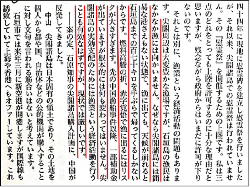 这个地方要特别注意,原文在“尖阁诸岛”处竟然画了一个引号,这是为什么呢?因为当时还没有“尖阁诸岛”之说。同时这个结论的提出者是琉球的著名历史学家,他如果不写下面“也不是琉球以外任何人的”这句话,不把它认定为一个“无主地”,那日本政府当然不会把这个报告公布在网上。