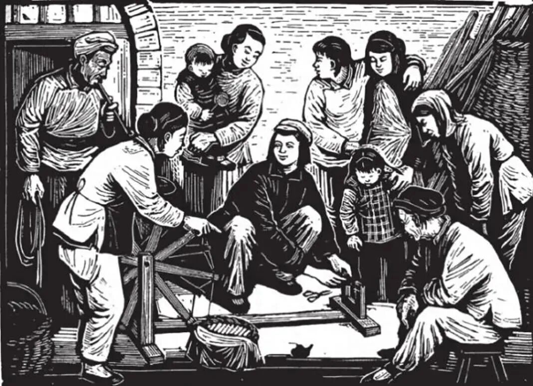 延安版画:力群,《帮助群众修理纺车》,黑白木刻,纵14厘米、横19.3厘米,1944年 | 图片来源:网络