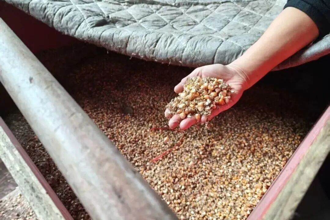 不仅农民挣不到钱,发霉的风险向链条下游传导,收购商可能也得赔钱:李军从南阳5毛8收购的玉米在运输途中一直下雨,棒子在车里发起了芽,到达目的地后,水分到了40%以上——这是水分密度仪能测出的最大数值。最后,5毛8收来的玉米粒被半价收购,三车买卖反而赔了五万块钱。河北市曲周县另一位玉米贩子收来几十万斤棒子,也都长出芽,如果卖掉,每斤湿粮要赔2毛5,如果不卖,还可能进一步霉化。