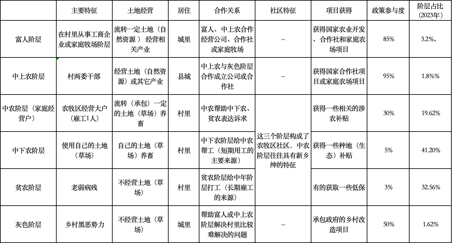 中农阶层以家庭经营为基础(通常雇工1人),通过流转或承包土地(草场)开展适度规模经营,是乡村社区的实际居住群体,承担着双重治理功能。