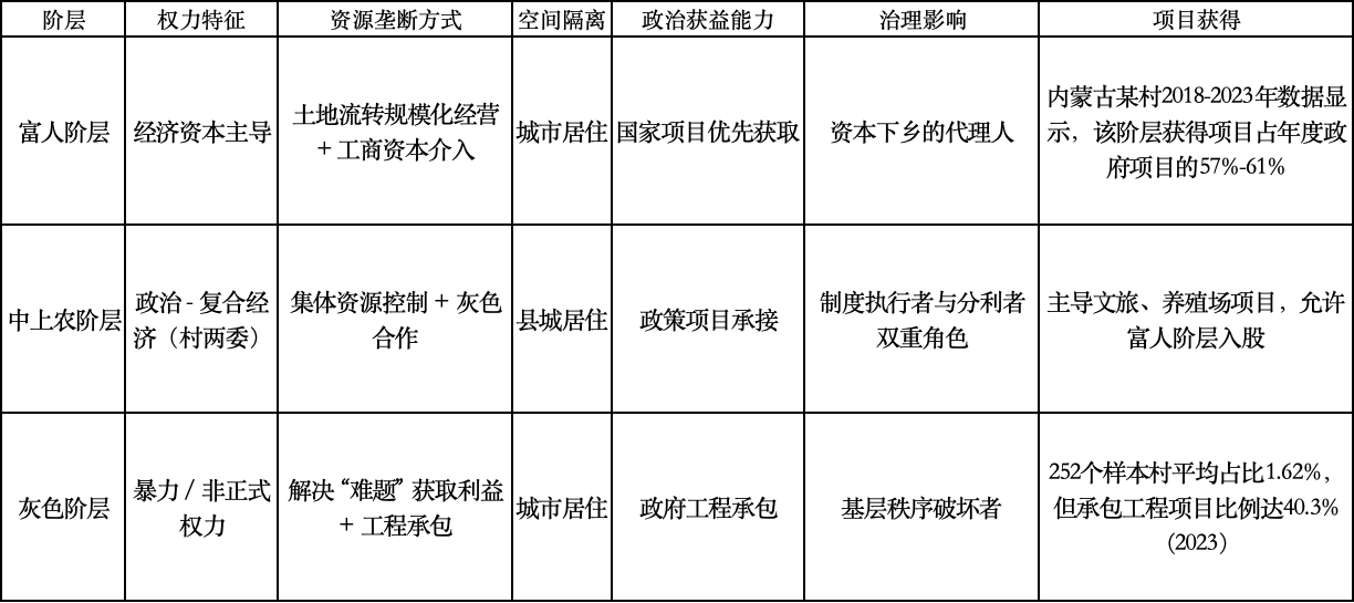 富人阶层、中上农阶层与灰色阶层构成 “资源垄断铁三角”,形成闭环式利益分配体系。其运作特征可通过表2进一步明晰:
