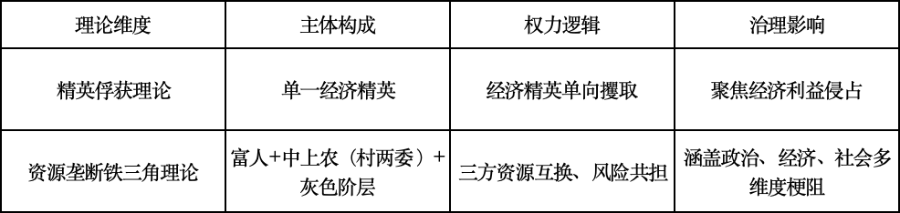 相较于聚焦经济精英单向主导治理、侵占公共利益的“精英俘获”理论,本文提出的“资源垄断铁三角”(富人+中上农+灰色阶层)显著拓展了精英权力结构分析维度(表3):主体上突破单一经济精英核心,纳入握有政策执行权与本土资源的政治精英(村两委,即中上农)、凭非正式权威充当中介的灰色阶层,三者形成“资源互换-风险共担”的闭环权力结构;运作逻辑上摆脱经济精英单向攫取资源模式,呈现中上农向富人倾斜资源,并借灰色阶层压制农户诉求、富人回馈利益巩固支持、灰色阶层获取中介收益的多维协同特征,权力渗透更隐蔽稳定。