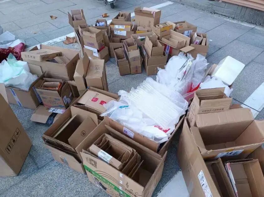 社团双十一快递盒REUSE活动中,一个傍晚收到的巨量快递包装 | 图片来源:作者供图