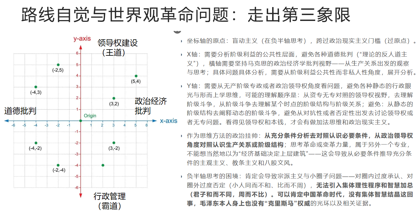 老田老师长期致力于中国革命和毛时代的历史与政治研究,他的分析为我反思环保工作提供了很多启发。在讲座《群众路线与人民史观——人民革命的政治公共性问题》(详情可了解预热推文《群众路线与人民史观:“打捞”劳动阶级的政治公共性》和上半场讲座稿《诚食讲座 | 老田:革命者的必修课:从“行政”到“政治”的思维转换》)中,老田用一张数轴图阐释“路线自觉与世界观革命”,讨论如何批判、如何组织行动的问题,我觉得很适合用来总结我的转变,以及当下我对环保道路的展望。批判方法(X轴)上,我们需要从道德批判走向政治经济批判,分析阶级利益的公共性,从结构的视角认识问题;动员思路(Y轴)上,需要从自上而下的、行政命令式的管理思维,转为自下而上的、激发人民群众主体性的领导权建设,让人们自觉地参与环保行动,把集体的事当作自己的事。这样才能走出第三象限的盲动主义(主观判断、盲目行动),跨过原点进入政治现实主义的层面,真正将环保当作一项公共的志业去做。